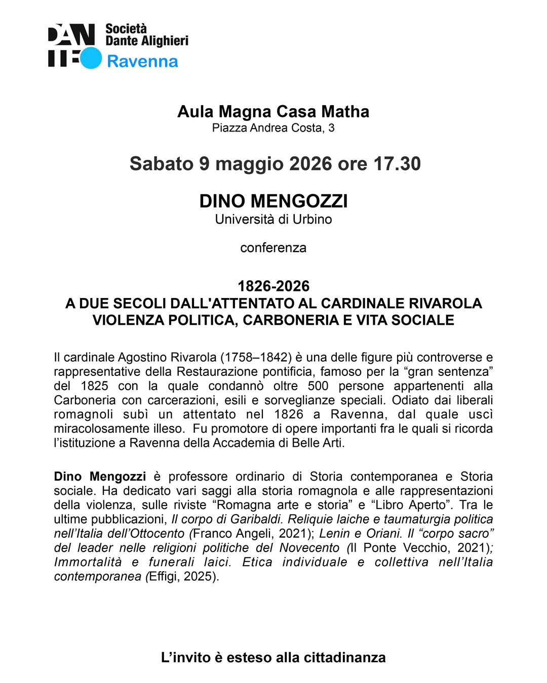 Dino Mengozzi – Università di Urbino conferenza 1826 – 2026 a due secoli dall’attentato al cardinale Rivarola + Aggiungi a Google Calendar + iCal / Outlook export Data 09 05 2026 Ora 17:30 - 19:30 Categoria PROSSIMI APPUNTAMENTI