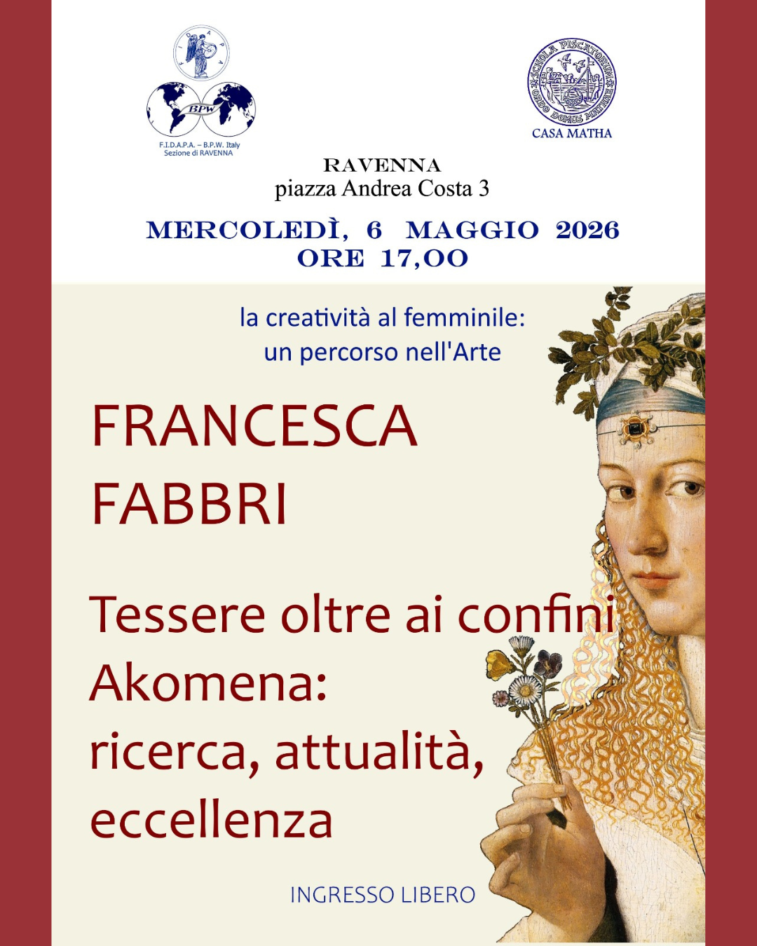 Francesca Fabbri: Tessere oltre ai confini Akomena, ricerca attualità, eccellenza (la creatività al femminile, un percorso nell’arte) + Aggiungi a Google Calendar + iCal / Outlook export Data 06 05 2026 Ora 17:00 - 19:00 Categoria PROSSIMI APPUNTAMENTI